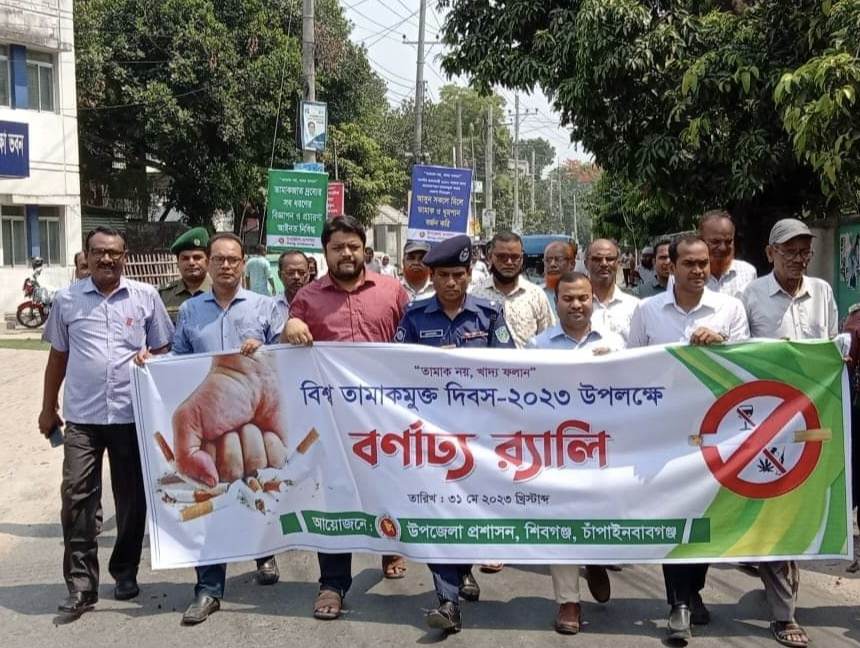 “তামাক নয়, খাদ্য ফলান” এই প্রতিপাদ্যকে সামনে রেখে চাঁপাইনবাবগঞ্জ শিবগঞ্জে বিশ্ব তামাক মুক্ত দিবস পালিত হয়েছে । ৩১ মে (বুধবার) সকালে শিবগঞ্জ উপজেলা প্রশাসনের আয়োজনে দিবসটি উপলক্ষে এক র্যালির আয়োজন করা হয়। র্যালিটি উপজেলা পরিষদ চত্বর থেকে শুরু হয়ে উপজেলার গুরুত্বপূর্ণ সড়ক প্রদক্ষিণ শেষে উপজেলা পরিষদ মিলনায়তনে এক আলোচনা সভা মিলিত হয়। আললোচনা সভায় সভাপতিত্ব করেন উপজেলা নির্বাহী কর্মকর্তা মো: আবুল হায়াত। আলোচনা সভায় আরো উপস্থিত ছিলেন উপজেলা সহকারি কমিশনার (ভূমি) মোহা: জুবায়ের হোসেন, শিবগঞ্জ থানা ভারপ্রাপ্ত কর্মকর্তা (ওসি) চৌধুরী জোবায়ের আহম্মদ, ডা: ফজলে রাব্বি, উপজেলা একাডেমিক সুপারভাইজার মোহা: মোর্শেদুল আলমসহ বিভিন্ন সরকারি দপ্তরের কর্মকর্তাবৃন্দ, বিভিন্ন ইউনিয়ন পরিষদের জনপ্রতিনিধিগণ ও বিভিন্ন শিক্ষা প্রতিষ্ঠানের শিক্ষক ও শিক্ষার্থীবৃন্দ। আলোচনা সভায় বক্তারা তামাক এর ভয়াবহ পরিণতির কথা উল্লেখ করে বর্তমান তরুন ও যুবসমাজকে এর প্রভাব থেকে দূরে রাখতে সর্বোচ্চ সতর্কতা অবলম্বনে সকলকে সচেতন হওয়ার আহবান জানান।