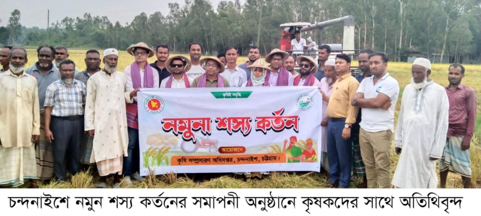 গত ১৪ মে উপজেলার হাশিমপুরে গাছবাড়িয়া ব্লকে বোরো ধান কর্তন ও নমুনা শস্য কর্তন উৎসব উপজেলা কৃষি সম্প্রসারণ অধিদপ্তরের আয়োজনে শুরু হয়ে গতকাল ২৫ মে শেষ হয়েছে। গত ১২ দিন ধরে বাংলামার্ক’র মার্কসান ব্রান্ডের কম্বাইন হারভেস্টার দিয়ে বোরো নমুনা শস্য কর্তন করা হয়। সমাপনী অনুষ্ঠানে সভাপতিত্ব করেন উপজেলা কৃষি কর্মকর্তা, কৃষিবিদ মো. আজাদ হোসেন। অনুষ্ঠানে প্রধান অতিথি ছিলেন- চট্টগ্রাম কৃষি সম্প্রসারণ অধিদপ্তরের উপ-পরিচালক মো. আবদুচ ছোবহান, বিশেষ অতিথি ছিলেন চট্টগ্রামের অতিরিক্ত উপ-পরিচালক মো. ওমর ফারুক, জেলা কৃষি প্রকৌশলী আমজাদ হোসেন। অন্যান্যদের মধ্যে আলোচনায় অংশ নেন- উপ-সহকারি উদ্ভিদ সংরক্ষণ কর্মকর্তা ইশতিয়াক আহমেদ আরিফ, বাংলামার্ক লিমিটেডের টেকনিক্যাল ডেপুটি ম্যানেজার রাশেদুল ইসলাম, ইঞ্জিনিয়ার মো. সুমন, ইঞ্জিনিয়ার মো. সামিউল ইসলাম, টেকনিশিয়ান মো. রাফিউল ইসলাম, টেকনিশিয়ান তৌসিফ আলম, অফিসের সকল কর্মকর্তা-কর্মচারী ও চন্দনাইশ উপজেলার বিভিন্ন ইউনিয়নের কৃষক ও কৃষাণীবৃন্দ। বক্তাগণ বলেন, আধুনিক কৃষির চ্যালেঞ্জ ও পরিচিতি হিসেবে গাছবাড়িয়া ব্লকের ৬০ জন কৃষকের সমন্বয়ে ৫০ একর জমিতে সমলয় চাষাবাদ করা হয়। আধুনিক কৃষির পরিচিতি হিসেবে এখানে ট্রে’তে বীজ বপন, রাইস ট্রান্সপ¬ান্টার এর মাধ্যমে চারা রোপণ, সমন্বিতভাবে পরিচর্যা ও পরিশেষে কম্বাইন হারভেস্টার এর মাধ্যমে ধান কর্তন করা হয়। এতে টাকা ও সময় অনেকটা সাশ্রয় হবে।