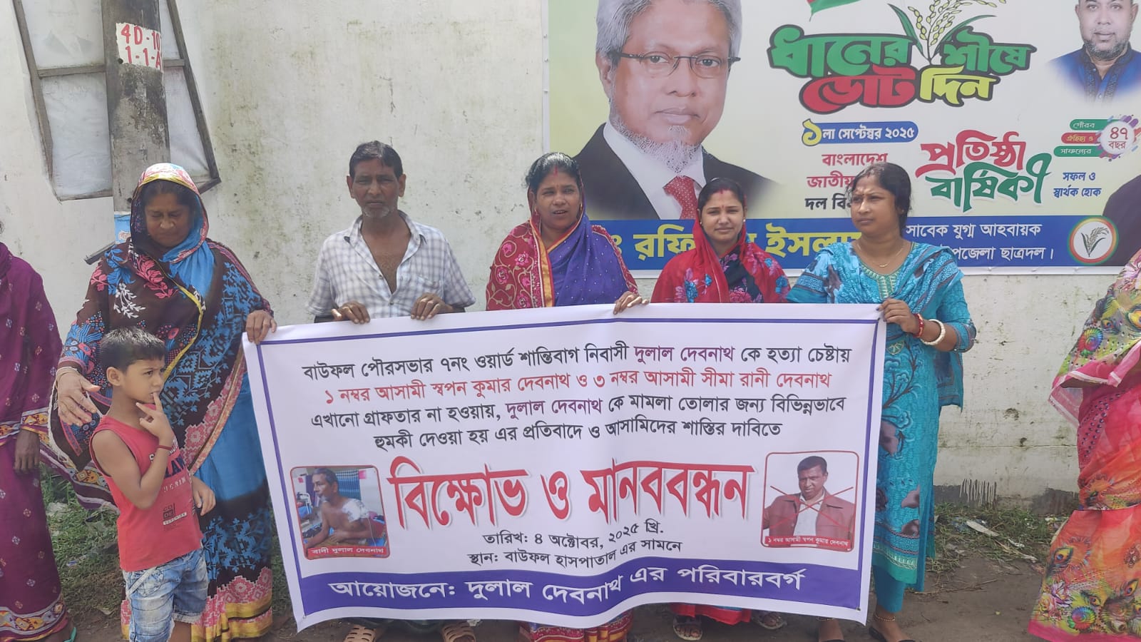 সবুজ সরকার পটুয়াখালী ] পটুয়াখালীর বাউফলে হত্যা চেষ্টা, ছিনতাই ও মারধরের মামলার এক নম্বর আসামি স্বপন কুমার দেবনাথকে গ্রেপ্তার না করায় এলাকাবাসীর উদ্যোগে মানববন্ধন ও বিক্ষোভ অনুষ্ঠিত হয়েছে। ভুক্তভোগী পরিবার